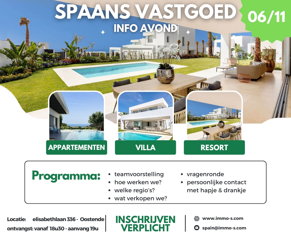 Hebt u interesse in Spaans vastgoed, bent u op zoek of wenst u zich te informeren over het aankoopproces? Kom dan gerust langs op deze info avond te Oostende georganiseerd door Immo-S, tevens erkend vastgoedmakelaar in België.Â